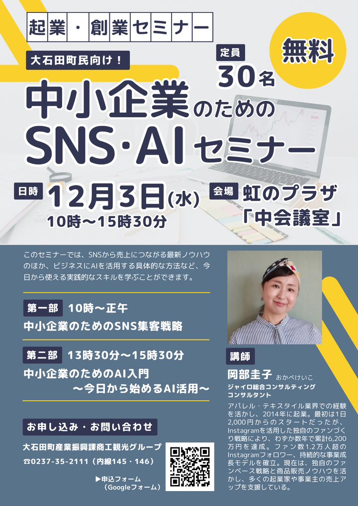 このセミナーでは、SNSから売上につながる最新ノウハウのほか、ビジネスにAIを活用する具体的な方法など、今日から使える実践的なスキルを学ぶことができます。