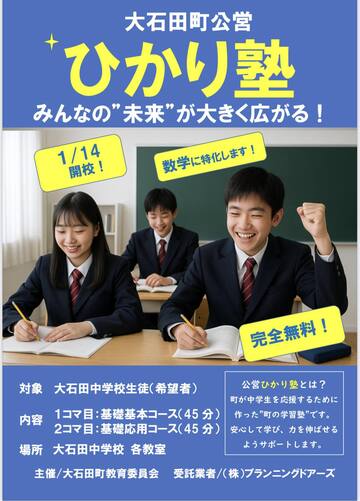 大石田町では3学期(1月)から、民間の塾会社と組んで、大石田中生徒が対象で数学に特化した平日の放課後に『公営塾』をスタートします!!(無料で、任意の申込みになります。)