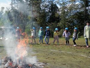 保育園のみんなでひろった杉の葉に火をつけると・・・燃える燃える!「火って離れても熱いね!」と驚く子どもたち。