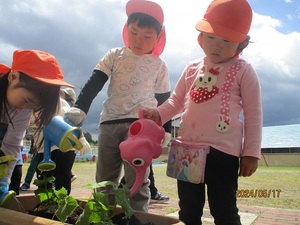 5月17日(金曜)、鷹巣の佐藤農園さんにお世話になり、3・4・5歳児が一人ひとりスイカの苗を植えました。苗は優しく持ってポットをそ~っと逆さまにして取り出すことや、土も優しくかけてあげるといいことを聞き、丁寧に植えた子どもたちでした。太陽の光をたくさん浴びて、大きなスイカに実るのを今から楽しみにしているようです。