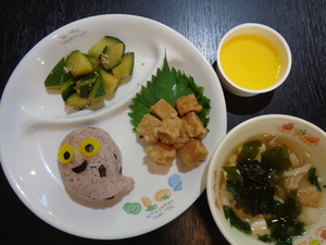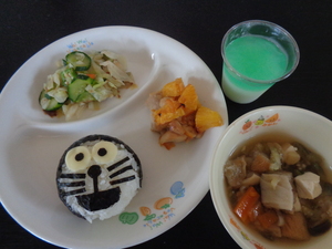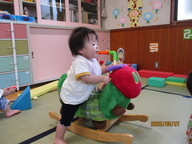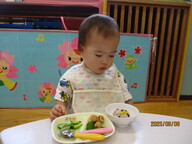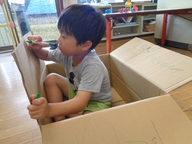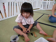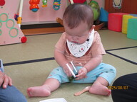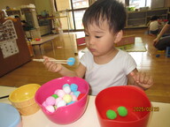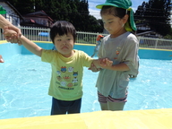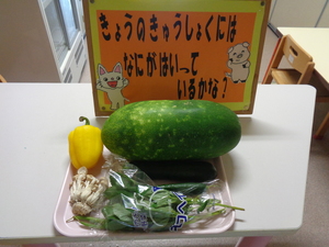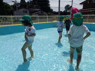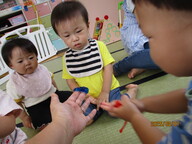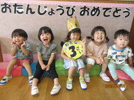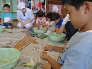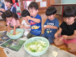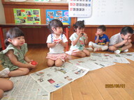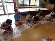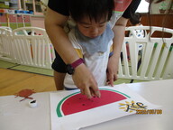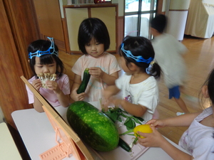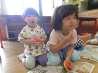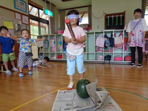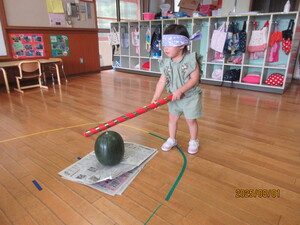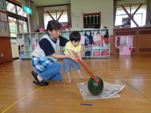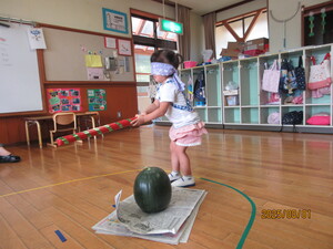 2.3.4.5歳児のみんなで、スイカわりを楽しみました。目隠しをして、一人ひとり順番で行ないました。周りの声をよ~く聞いて、スイカを狙い楽しみました。夏らしいスイカの産地ならではの遊びを満喫し、美味しくいただきました。美味しかったね!