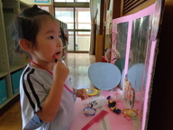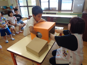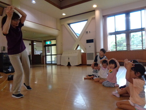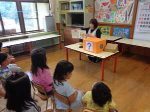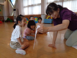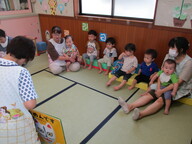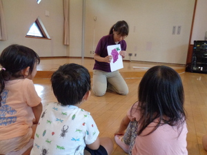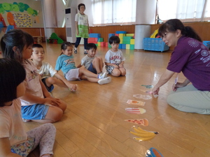 8月7日(木曜)、3.4.5歳児の子どもたちが大石田町国際理解教育専門員の小野エイミー先生と英語にふれあって遊びました。カードのイラストを見ながらエイミー先生のことばを真似っこしたり、歌を歌ったりして楽しみました。最初は緊張気味の子どもたちも、最後には笑顔いっぱいになり素敵な体験となりました。