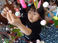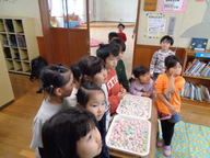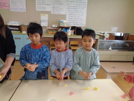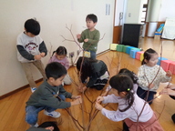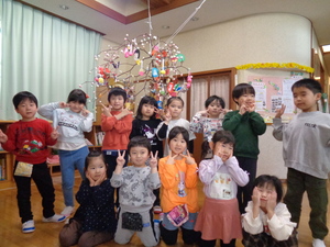 旧正月の1月15日(木曜)に、地域行事「だんごさし」を行ないました。前日に、3.4.5歳児がみずきの木の芽かきをしました。だんごは、赤・白・黄・緑の四色で、柔らかな感触を楽しみながら、まん丸を意識して頑張って丸めました。そして、茹であがっただんごを、みんなで願いを込めてだんごさししました。今年もみんな元気いっぱい過ごせますように…。