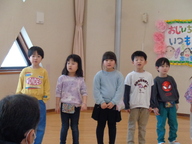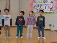 1月22日(木曜)に、5歳児さくらぐみの祖父母参観がありました。おじいちゃん・おばあちゃんに喜んでほしい思いから、この日まで準備や練習を一生懸命頑張ってきた子どもたち。大好きなおじいちゃん・おばあちゃんと一緒にフレーム製作を楽しんだり、できるようになったことを自信をもって発表したりしました。劇「さるかにがっせん」も見てもらい、じゃんけん列車などふれあいあそびをした後は、日頃の感謝をことばにして伝えました。ちょっぴり緊張した姿がありましたが、優しいおじいちゃん・おばあちゃんと保育園でふれあい、とっても嬉しそうな子どもたちでした。