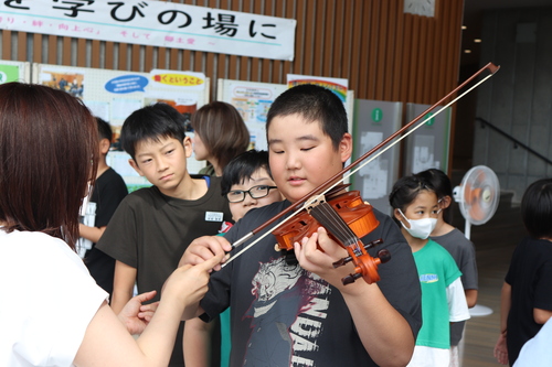 初めて触る楽器にドキドキしながらバイオリンを持ち、弓を弾いてみます。