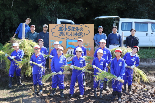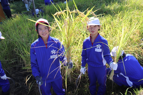 9月24日秋晴れのさわやかな天気の中、5月に田植えをした稲が大きく育ち、5年生が稲刈り体験を行いました。