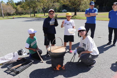 わくわく班のみんなで協力して、火をおこし、材料を切り、大きな鍋で煮ていきました。