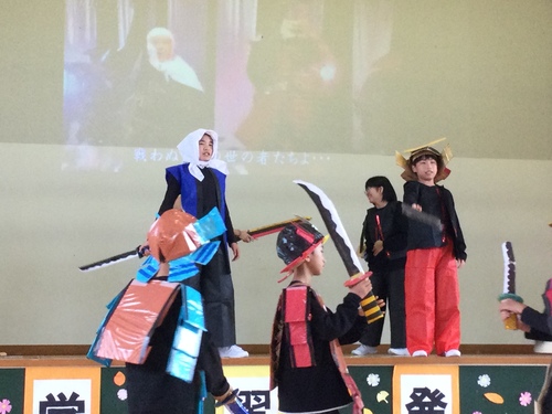6年生は社会科の歴史で学んだことを生かして、戦国時代の「天下統一」という歴史上の大きな出来事についての創作劇です。
