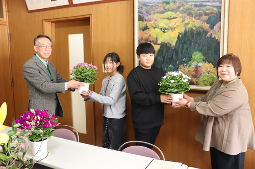 人権擁護委員の方が来校し、6年生の代表児童に人権の花の贈呈式を行いました。