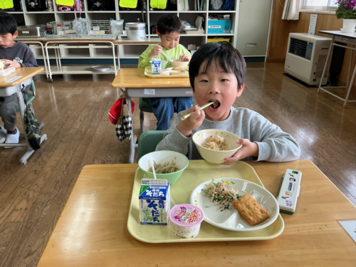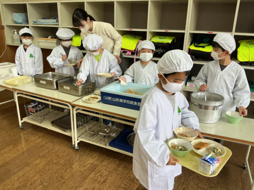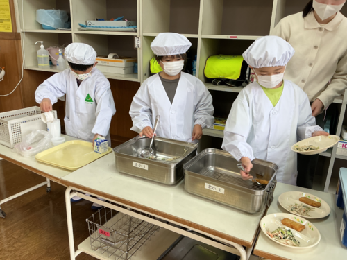 重い食缶も牛乳も一生懸命運び、盛り付けました。