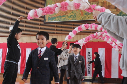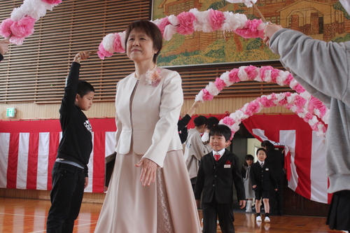 6年生の花のアーチに迎えられ、担任の先生方を先頭に、ニコニコ顔の入場です。