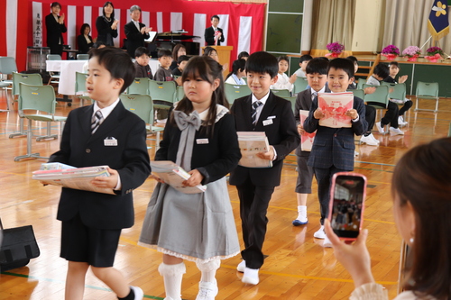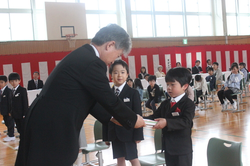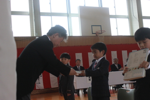 そして、一人一人に校長先生から教科書や交通安全のきいろいぼうし、そして、大石田かるたをいただきました。