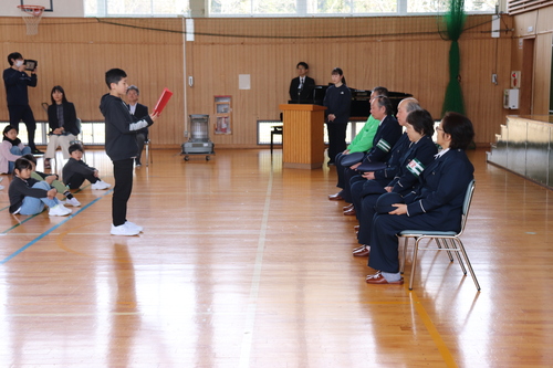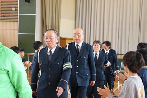 今日は、登校下校の様子を見守ってくれるスクールガードリーダーさん、4名の交通指導員をお招きして、「どうぞよろしく」という気持ちを込めた顔合わせの会を行いました。