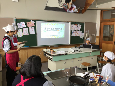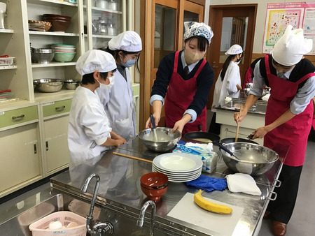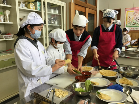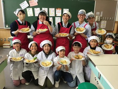 12月4日(木曜)に、4年生は総合的な学習の時間の「そば」についての活動として、北村山高等学校そばガールズ&ボーイズのみなさんと交流学習を行いました。高校生のそばについての研究発表を聞いた後、そばクレープづくりに挑戦しました。優しく、丁寧に教えてくださる高校生のお兄さん、お姉さんと一緒に、クレープの生地を焼いたり、クレープに具材を包んだりして、おいしいクレープが完成しました。