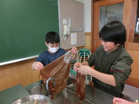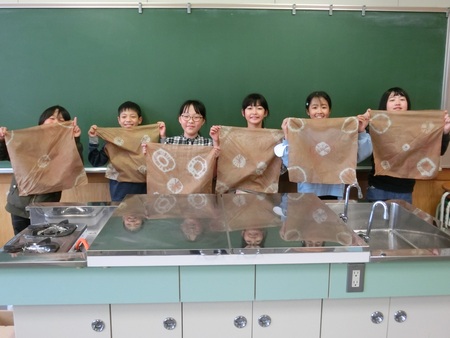 4年生は、そば殻を使って、そば染めに挑戦しました。作り方は、北村山高等学校そばガールズ&ボーイズ担当の先生に教えていただきました。優しい色合いのそば染めのハンカチ、世界でたった一つのハンカチができました
