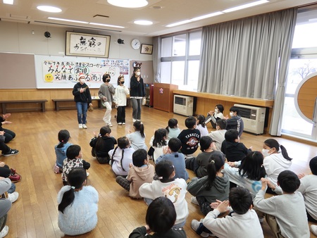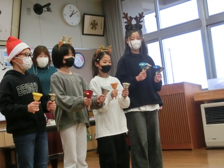 12月22日(月曜)の児童集会では、健康保健委員会からはメディアに関する発表がありました。自分たちで作成した動画を使って、メディアを使う時の姿勢や、肖像権など、正しく上手に使うための発表をしてくれました。その後、音楽クラブのクリスマスコンサートがありました。部員全員そろってできなかったのですが、クリスマスの曲を打楽器を演奏しながら歌ったり、ハンドベルで演奏したりと、素敵な音楽を奏でてくれました。