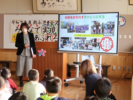 12月23日(火曜)、2学期79日間が終わりました。代表して、1年生と6年生が「2学期がんばったこと」の発表をしました。マラソン記録会や、学習発表会など、行事を通したがんばりや、各学年で取り組んだ活動の中でたくさんの成長が見られた2学期でした。話の聴き方が、とても立派な南っ子です。