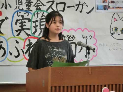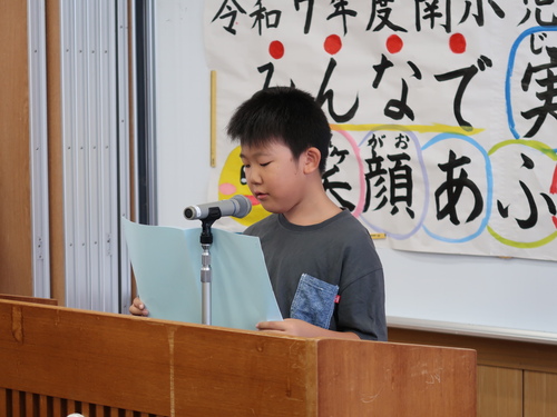 9月8日(月曜)、朝の集会で、『2学期がんばること』の発表をしました。目標を達成するために、3年生と6年生の代表になった二人は、自分の目標と、目標を達成するためにどんなことに取り組むのかを堂々と発表しました。二人の発表を「目と耳と心で」しっかりと聴く姿がたくさん見られました。
