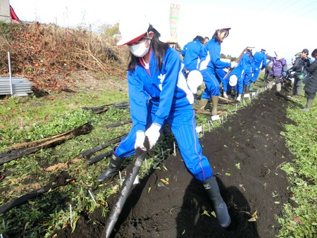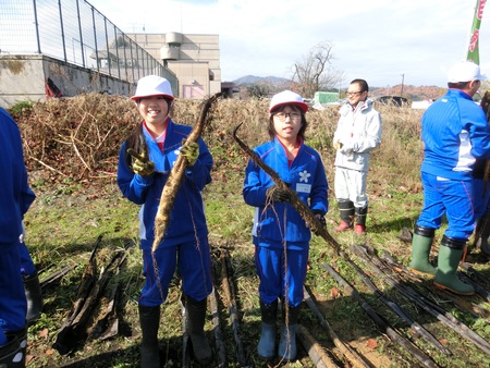 11月13日(木曜)に、町内3小学校の6年生が、5月に植え付けた自然薯の収穫体験を行いました。秋晴れの素晴らしい天候に恵まれ、子どもたちは自然薯がどのくらい大きく育っているのかわくわくしながら収穫しました。一人3本収穫し、1本は自宅におみやげに持ち帰りました。残りの2本は、あったまりランドで後日、販売会を行います。活動の様子は、テレビや新聞でも紹介されました。