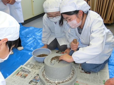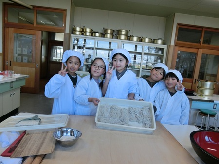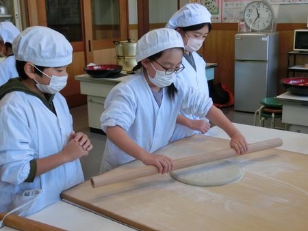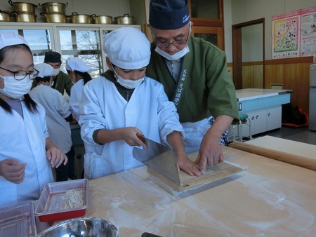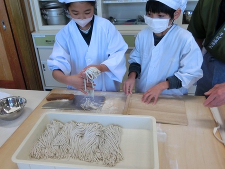 11月20日(木曜)に、そば打ち体験を行いました。そば道楽の会の方を講師に迎え、石臼での粉ひき体験とそば打ち体験をしました。そばの香りを楽しみながら、そば粉からそばになるまでの工程をみんなで協力し合って行いました。出来上がったそばは最高においしかったようです。