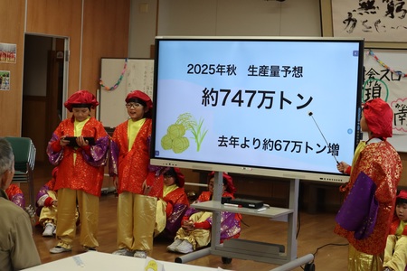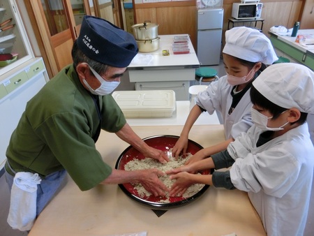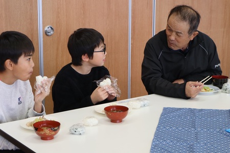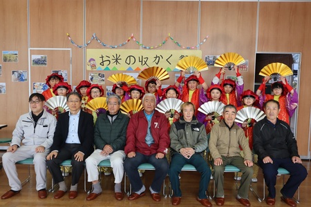 5年生は、11月28日(金曜)に、米作りと大黒舞でお世話になった地域の先生をお招きして、収穫祭を行いました。自分たちが米について調べてまとめたものを発表した後、大黒舞を披露しました。そして、今年収穫したお米を使って3種類(塩、ツナマヨ、わかめ)のおにぎりとみそ汁、野菜炒めも作って、先生方にごちそうしました。おいしいおにぎりを食べて、みんな笑顔いっぱいになりました。最後に、感謝の気持ちを手紙にして先生方にお渡ししました。一年間、ありがとうございました。