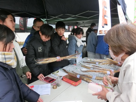 11月26日(水曜)、6年生はサンサンスタディの活動の一環で、収穫した自然薯の販売活動を体験しました。あったまりランド深堀を会場に、販売開始、早々から多くのお客さまに自然薯を買っていただき、あっという間に完売しました。自分たちが育てた自然薯を買っていただく喜びや、買ってくださった方の笑顔を見て、作物を育てる喜びを実感できたようでした。買いに来てくださったみなさま、ありがとうございました。