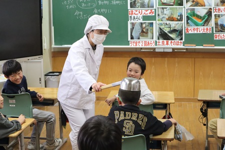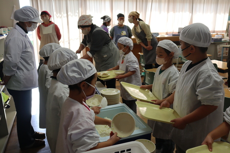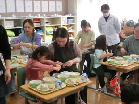 11月14日(金曜)に、1年生の親子給食を行いました。お母さんと一緒に栄養について勉強した後、給食の配膳の様子を見ていただき、一緒に給食をいただきました。お母さんと一緒に食べる給食は、いつも以上においしかったようです。