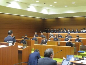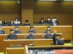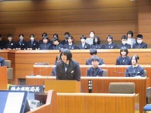 役場議場にて、2学年の生徒たちが「子ども議員」として一般質問を行う子ども議会が開催されました。町議会議員さんから議会についての説明を聞いたり一般質問の作り方を聞いたりしながら、町の現状や将来について考え、班ごとに質問を練り上げて本番の議会に臨みました。本物の議員席に座り、町長さん、教育長さん、課長さん方を前に質問を行うということで、緊張していたようですが、堂々としっかり発言をすることができました。どの班の質問にも、町長さんはじめみなさんが丁寧に前向きに答弁してくださり、町の仕組みについての理解と町民としての意識が高まる貴重な体験となりました。