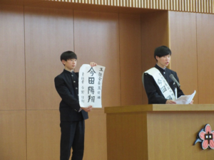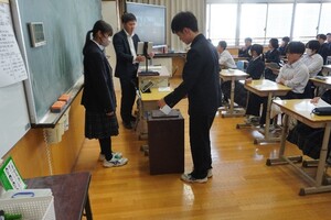11月14日(金)に生徒会役員選挙立会演説会が行われました。インフルエンザの広がりが見られ始めたため、体育館での立会演説会には選挙管理委員と立候補者、推薦者のみの参加となり、全校生徒はオンラインで教室での参加となりました。そのような中ではありましたが、立候補者の熱い思いと決意が学校中に伝わる凛とした雰囲気の中で演説会が進行し、教室での投票でも一人一人が真剣な表情で一票を投じていました。責任者、推薦者はもちろん、全校生徒から期待の一票をいただいたみなさん、「笑顔・活力・信頼」あふれる生徒会活動をよろしくお願いします。