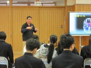 11月5日(水)に学校薬剤師の田中智明先生より、3年生対象に「薬の安全な使用について」、お話をお聴きしました。 麻薬や大麻などの危険薬物だけでなく、身近にあるカフェイン飲料(ドリンク剤を含む)の摂取のしかたにも、気をつけていく必要があることに、驚きを示す生徒が多くいました。また、ドーピングやオーバードーズの問題についても、身近なこととして理解を深めることができました。